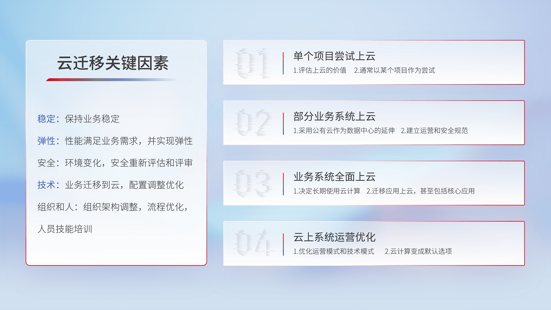 结合实际业务,,,从规划设计、、云平台选型、、、云原生改造、、数据迁移、、、集成交付,,,,迁移全过程为客户识别最佳上云路径,,,做好风险识别管理,,,,设计网络架构、、身份权限、、、、安全审计合规、、、、操作审计、、、、日志审计、、、、监控告警策略、、、、多站点容灾设计等,,,,对云上基础设施进行整体规划,,,提升IT治理水平,,,,以满足弹性、、、、高可用、、、高性能的需求。。