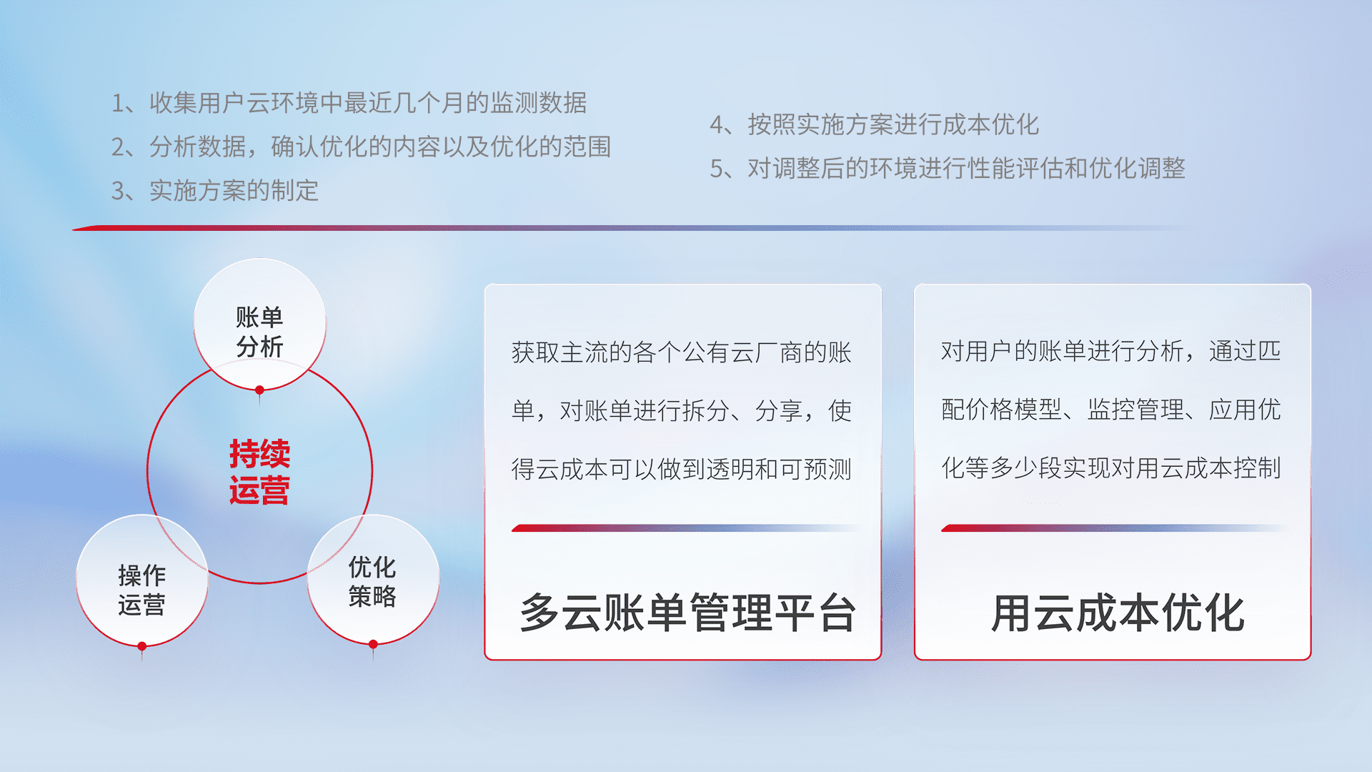 通过多云纳管,,,,以统一的资源数据模型把客户的云资源进行抽象和封装,,,,进而实现对多云资源的统一操作,,,,保障云资源管理的可靠性、、、、稳定性与可用性。。量身定制化运维内容,,,配置、、、开发运维、、补丁管理、、、、备份、、、监控、、、认证和访问管理、、、审计和日常巡检等,,,保障在用云过程中的可靠度,,稳定度以及高可用率。。。。